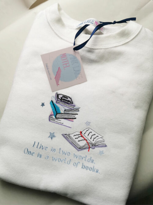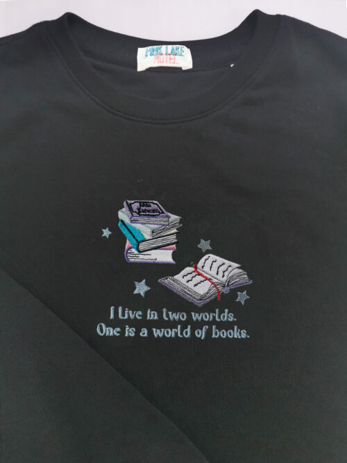 This tshirt/crewneck/hoodie is embroidered with a quote “I live in two worlds, One is a world of books” and open books