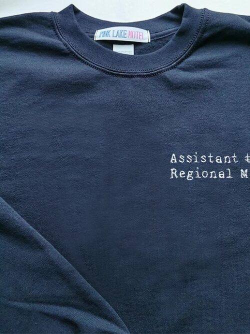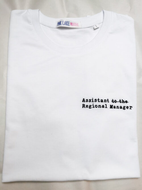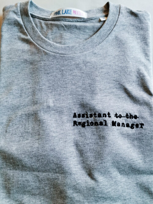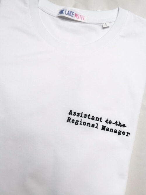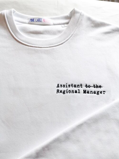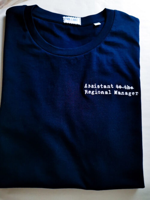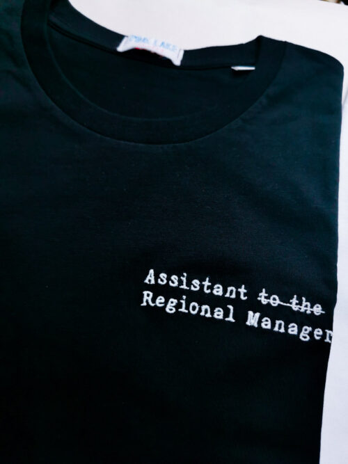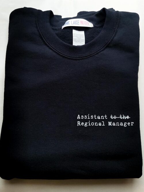This garment is embroidered with Assistant to the Regional Manager. It is inspired by the show The Office.