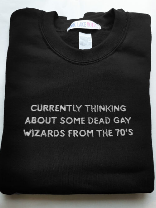 This garment is embroidered with “Currently thinking about some dead gay wizards from the 70’s”.