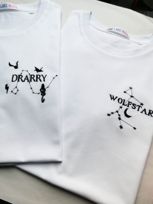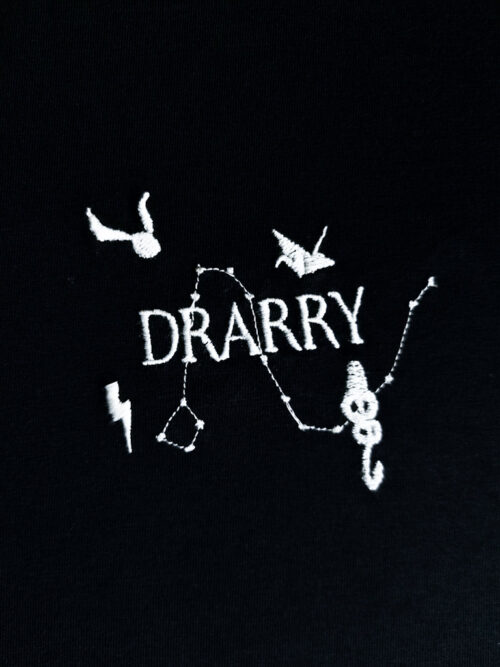 This garment is embroidered with Drarry, with the constellation Draco, a lightning bolt, the dark mark, a snitch and an origami.