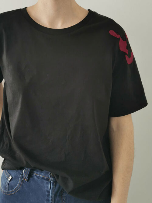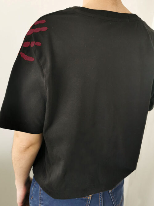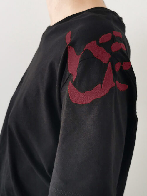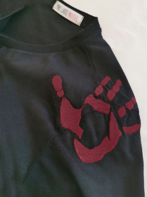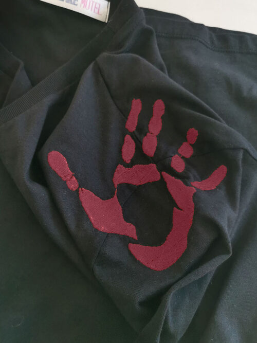 Castiel’s handprint embroidered in Burgundy thread on the left shoulder of either a black classic t-shirt, a sweatshirt or a hoodie. It is inspired by the show Supernatural.