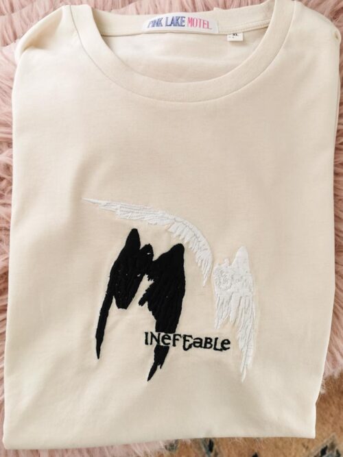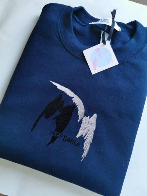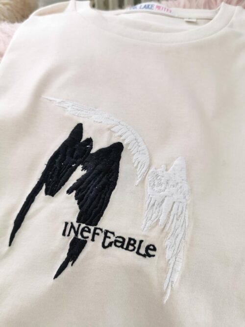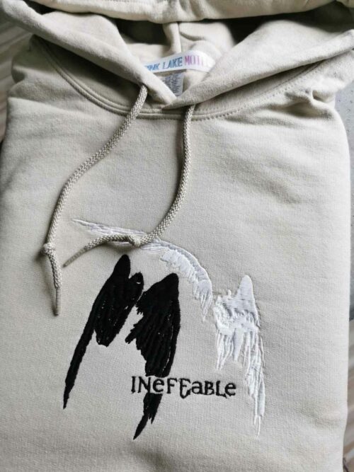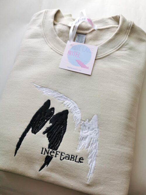 Aziraphale and Crowley’s wings with the word “ineffable” embroidered on a beige t-shirt, sweatshirt or a hoodie.