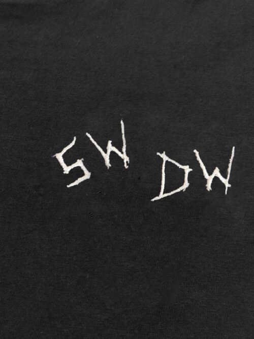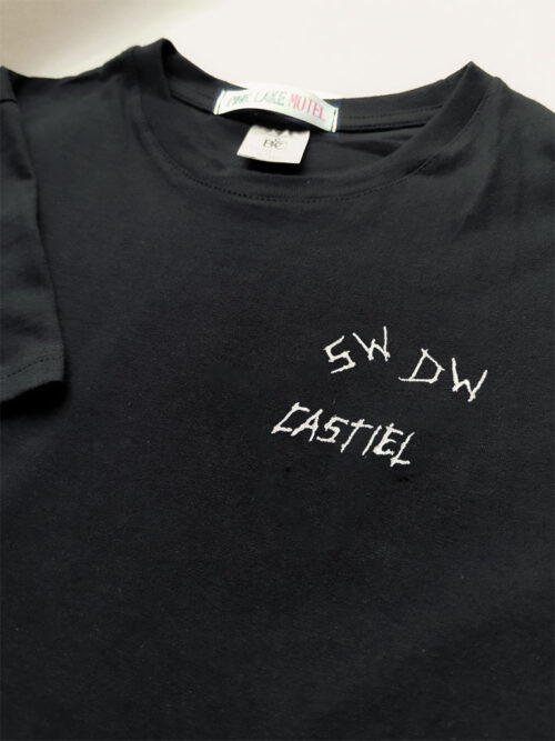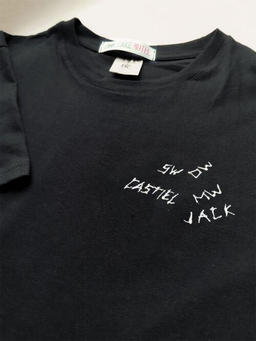 Initials and names carvings embroidered on either a black classic t-shirt, a sweatshirt or a hoodie.