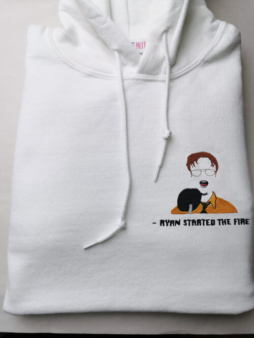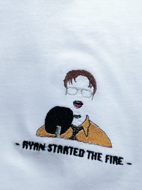 This garment is embroidered with “Ryan started the fire” and Dwight’s face. It is inspired by the show The Office.