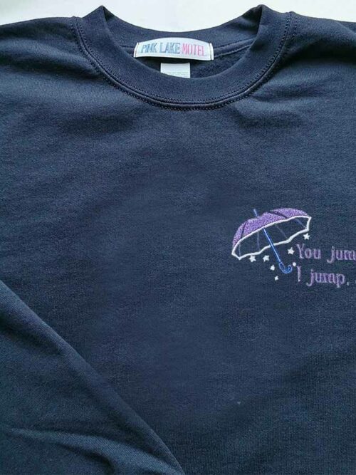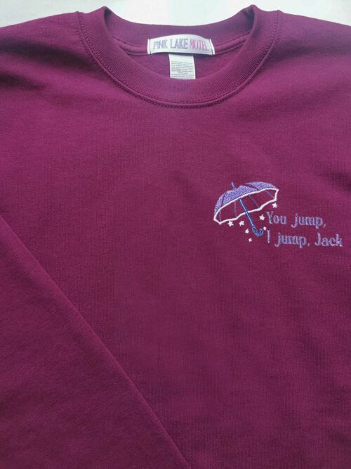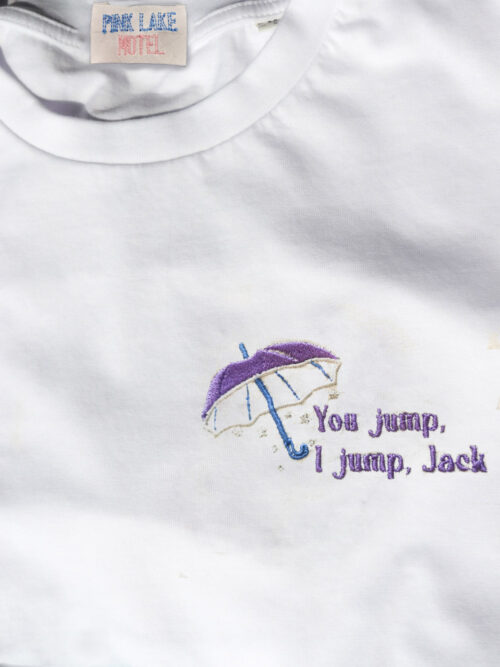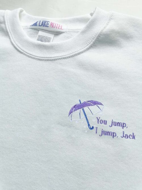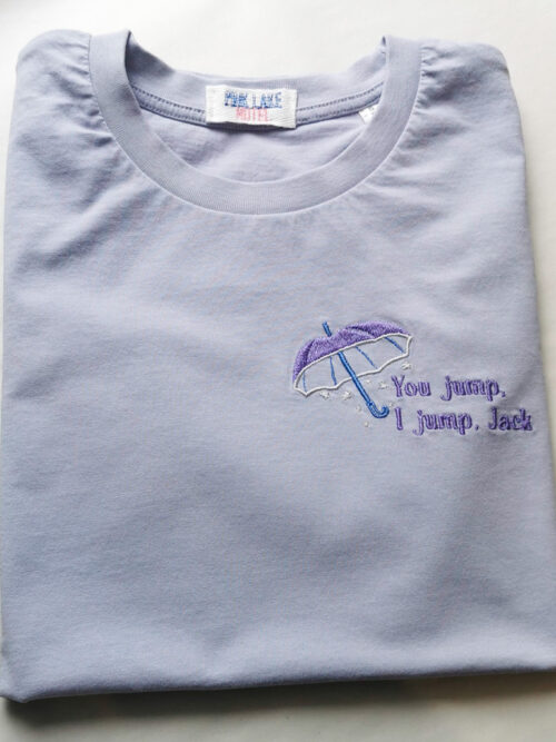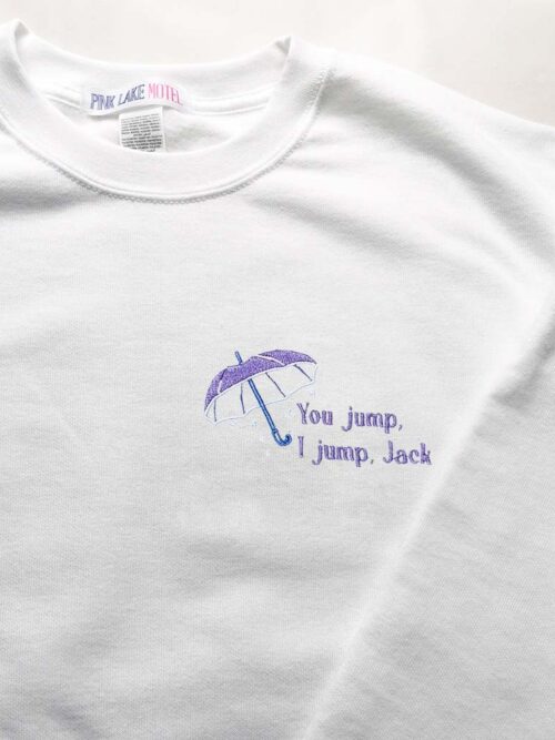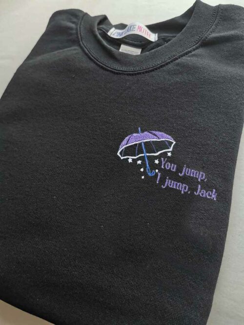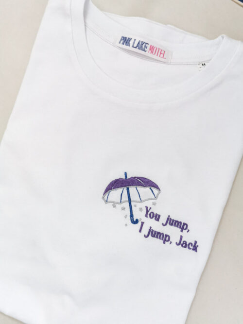 This garment is embroidered with a quote : “You jump, I jump, Jack” and an umbrella.