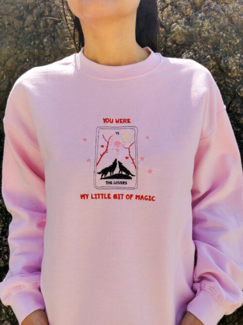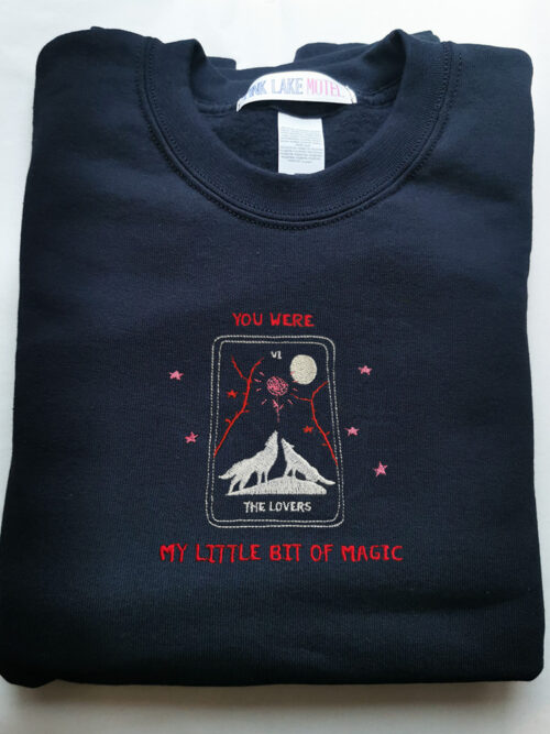 This garment is embroidered with “You were my little bit of magic” from All the young dudes.